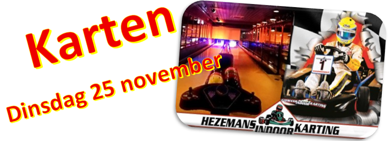 Op dinsdag 25 november gaan we met eigen vervoer naar Hezemans Indoor Karting op Vijfkamplaan 18,